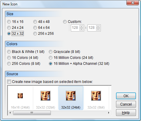 By default the new icon will be blank, but you can choose to start with a copy of an existing icon instead. To do this, enable the source check box and select an icon from the list. If necessary the copy of the source icon will be scaled to match the selected new icon size. This can be a quick way to create a multi-resolution icon. For best results, the source icon should be the same size or larger than the new icon.
