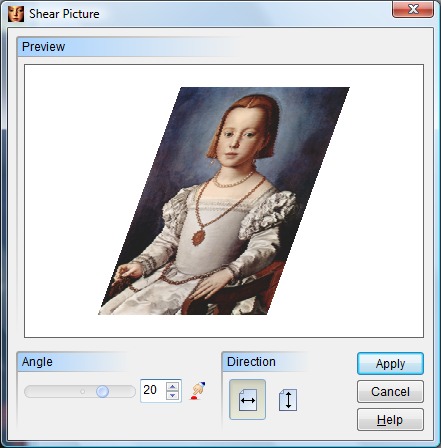 Use the slider control to specify the desired shear angle (-45° to 45°). A negative angle will shear to the left or top, and a positive angle will shear to the right or bottom. The Direction of the shear can be changed by clicking the horizontal (left/right) or vertical (top/bottom) icons. A Preview window is available to guide you in choosing the correct angle. When you are satisfied with your choice, click the Apply button to perform the shear effect.