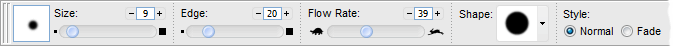 The Flow Rate control on the Option Panel (pictured above) dictates how quickly paint flows from the Spray Can. A slower Flow Rate will give you more control, while a faster rate is better for bold strokes. Like the Paint Brush, the size, edge and shape of the area covered can also be adjusted from the Option Panel.