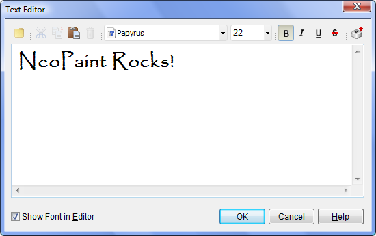 button to insert special symbols (like © and ®). The remaining buttons allow you to access the Windows clipboard and set the font face, size and style. Enable the Show Font in Editor option to preview the selected font and size as you enter text.