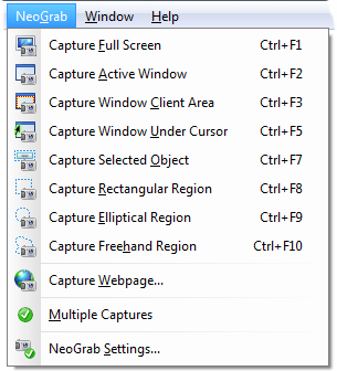 This section contains descriptions of the commands found in the NeoGrab menu. For more information, select a command from the picture below: